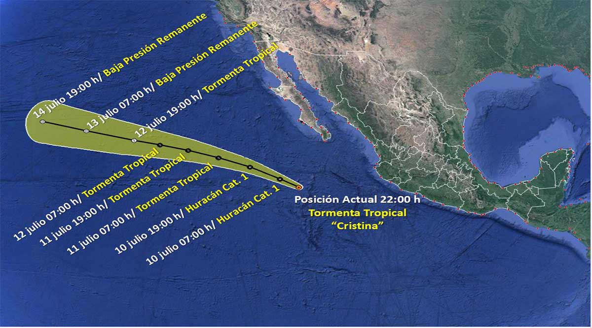 La Paz.-El centro de la tormenta tropical “Cristina” se localiza al sur-suroeste de las costas de Baja California Sur, manteniendo el potencial de lluvias muy fuertes en zonas de Sinaloa, Nayarit, Jalisco y Colima, así como lluvias puntuales fuertes en Baja California. Asimismo se pronostican rachas fuertes de viento y oleaje elevado en costas de Baja California Sur, de acuerdo al reciente reporte del Sistema Meteorológico Nacional (SMN).